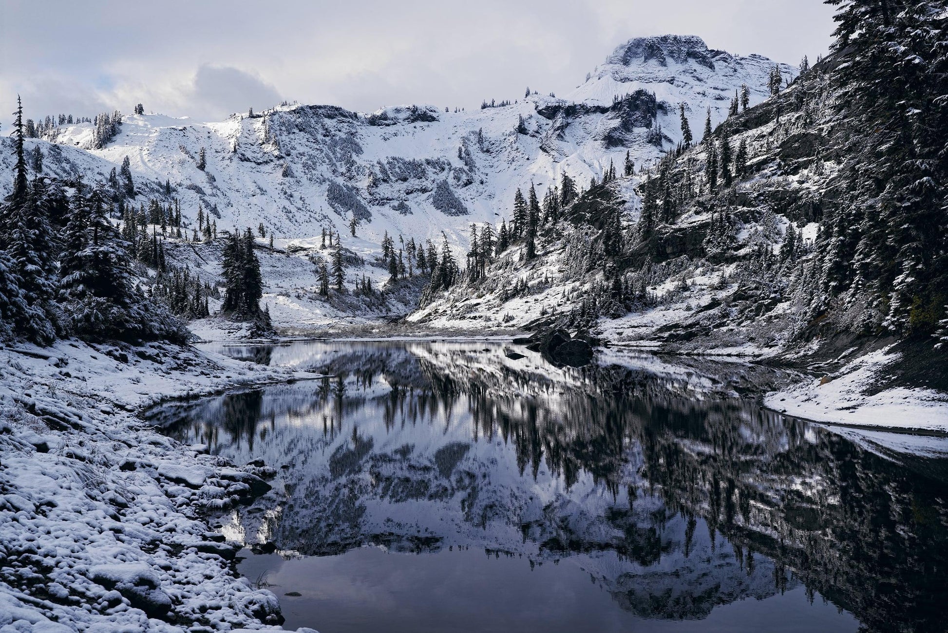 September 30, 2009–the first snowfall of the season on the peaks of Mount Baker. Just the previous day, the sun was shining and there was not a snowflake on the mountain. I parked the camper for the night and set the alarm for sunrise. When I arrived, I was completely floored! I thought I was in a different place for a minute. My heart raced as I grabbed my gear and hiked under twilight up to the shores of this enchanted lake. Moments before taking this shot, the sun peaked through the clouds and gently lit the edge of the ridge. This was the magic touch that made this shot! It was just incredible how much Mother Nature can change overnight, creating this silent scene broken only by the sound of my shutter.