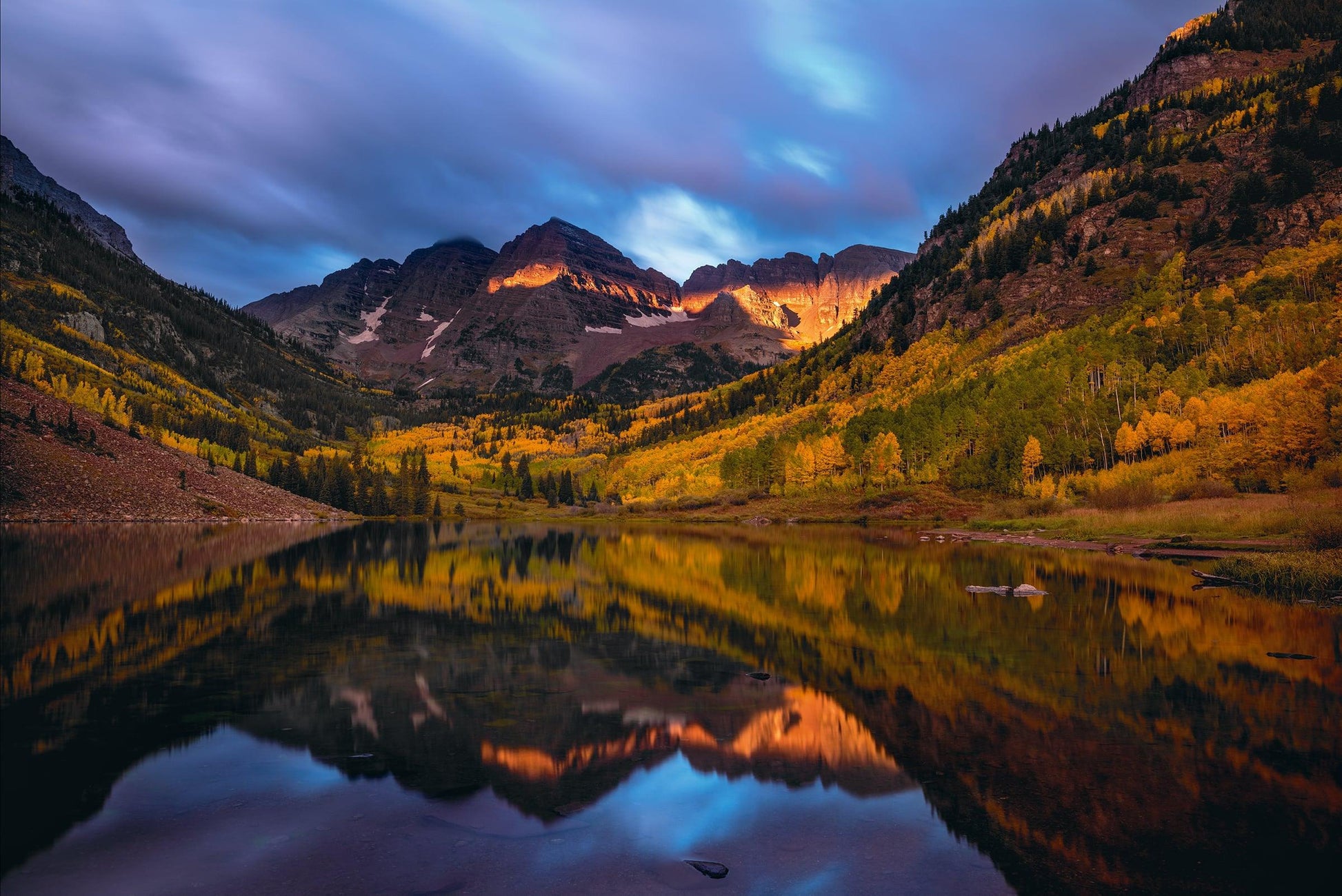I have often said that a perfectly sunny day can be a real enemy, which is why I am always on the lookout for clouds and moody weather patterns. When I awoke on this day in Colorado and noticed the ominous skies, I quickly gathered my gear and rushed to my location while the landscape maintained its pre-dawn tones of blue and purple. Just as I reached the edge of the lake, an early morning shaft of light broke through just enough to completely highlight this expansive scene – which almost appeared as if two worlds were colliding directly in front of me. The waters lay still enough on this calm, silent morning to perfectly reflect the yellow, green, and brown layers of earth and forestry stacked hundreds of miles high. I set up my camera and opted for a long exposure, giving the sweeping clouds movement and amazing character. As I snapped the shutter, I could feel the crisp, Aspen air against my skin. It is a life-affirming moment that I can still vividly sense each time I gaze at this photograph.