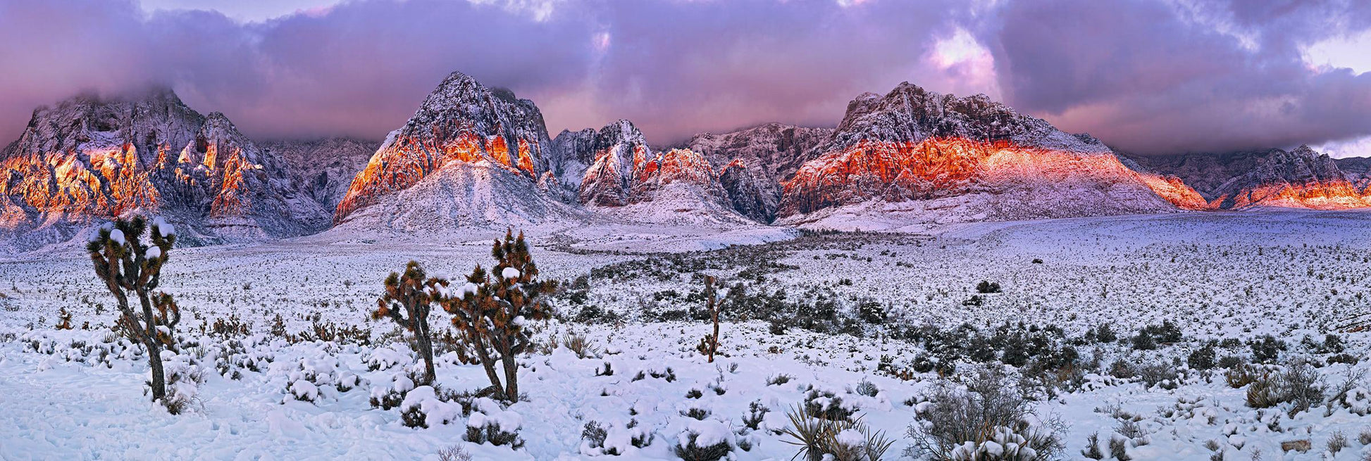 A record snow fall just before Christmas of 2008 provided the right opportunity for me to capture magic in the desert. The morning of December 16, 2008 was a morning I will never forget! Following my intuition that has guided me throughout my career, I was on the road at 5:00 am heading out to Red Rock Canyon, a short drive from my home. Under the darkness of the winter skies, I set up my tripod and I felt something spectacular was about to happen. My heart raced as I watched a golden band of sunlight squeeze through a heavy cloud. This majestic scene that had generously revealed itself to me vanished in seconds — the light was gone, the moment over, only to live in my memory and on film forever.