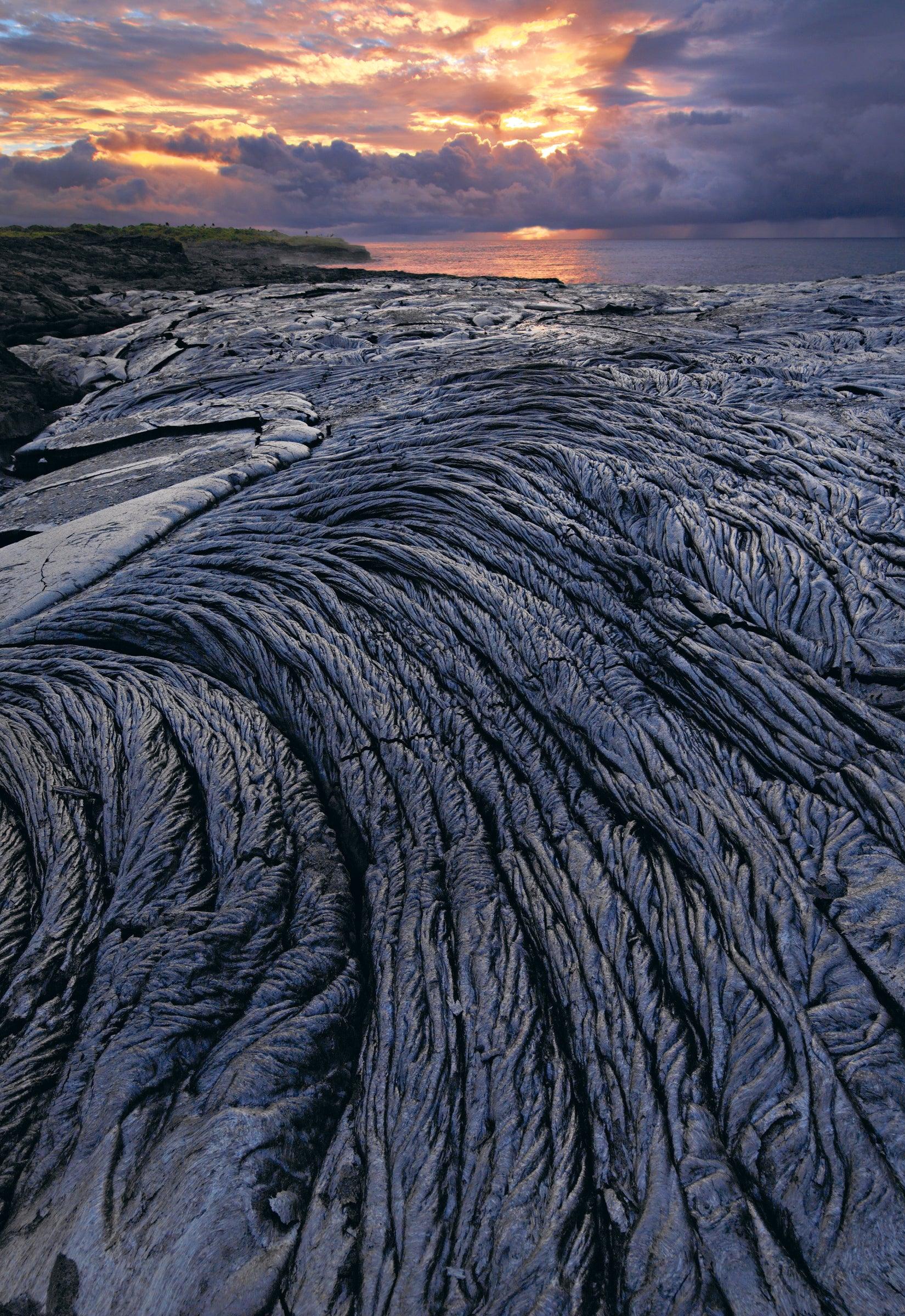 Combining excitement with just the right measure of danger and uncertainty, no experience is as challenging nor carries a payoff so rewarding as shooting an active volcano. For a month I lived and worked on Hawaii’s Big Island while keeping a Spartan schedule, waking up at 1:00 am to shoot lava brightened only by starlight. Even a sliver of sunlight can destroy a shot. It’s like watching fireworks at noon. The day before I walked on this very lava, it was actually magma–bubbling within the Earth’s crust. Still, I couldn’t squander the opportunity to forever capture these rope-like rivulets of lava. Treading lightly on terra that wasn’t yet terribly firm, my fears reached their zenith when I set up my tripod only to watch its legs hiss, burn and slowly melt.