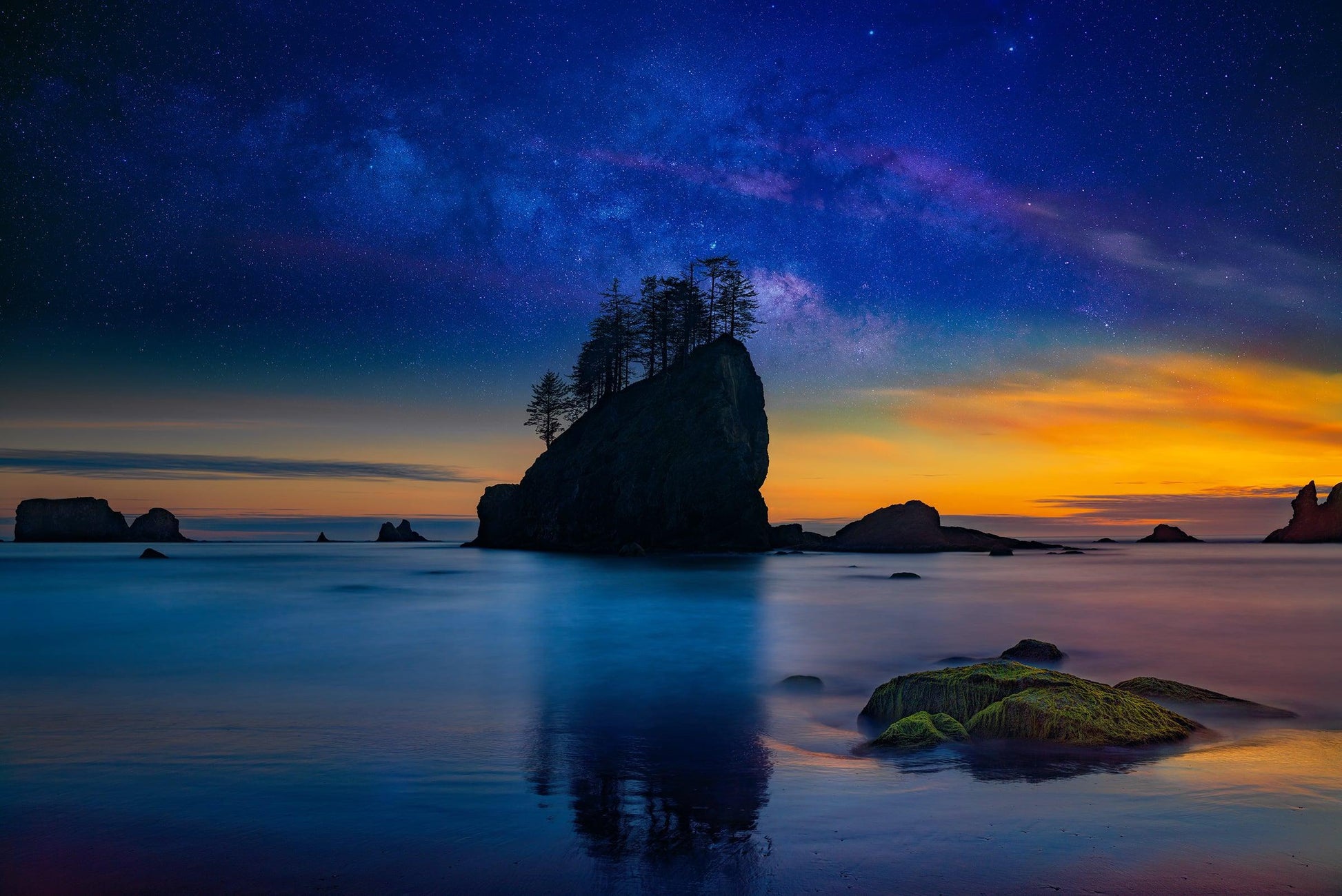 I’ve always had a deep fascination with the night skies. As a kid, I remember my dad pointing out the constellations. All we saw back then was a black sky and millions of stars – only what the naked eye could see. The camera totally changed that vision. Exploring the Olympic peninsula, I searched for a totally remote location – away from as much light pollution as possible. This amazing silhouette of the sea stack, reaching towards the night sky – it was the perfect scene to complete the image I was chasing.