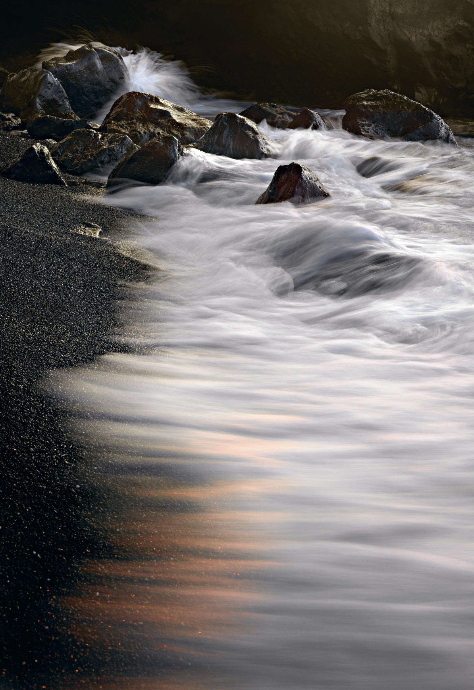 After searching an island’s worth of beaches, continually attracted to the diversity and uniqueness that Kona’s beaches offer, I felt that this isolated cove was the right place to set up. With my feet planted firmly in the ever-moving shoreline on this balmy Hawai’ian afternoon, I placed my tripod directly in the surf and waited for the sun to set behind the cliffs. It cast an unexpected golden glow on the inky rocks, a glow which I knew would vanish within moments. This long exposure captured the mood I was feeling. The waves breaking in the background added depth and dimension to the scene.