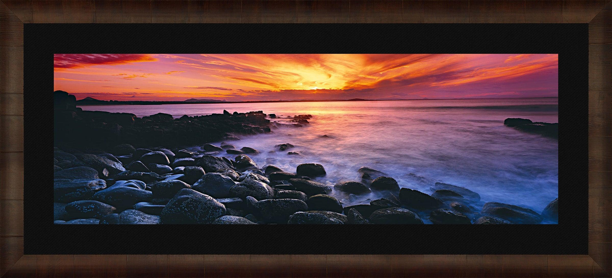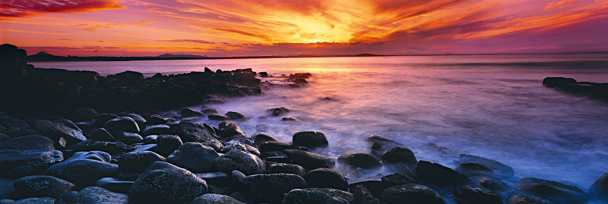 I had been shooting in and around Noosa for a week trying to capture the perfect sunset, and I had tried many locations and compositions in order to get the mood I was after. Exploring this cove, I picked out a section of barnacle covered rocks that I knew would create an interesting foreground and set up my tripod precariously. As evening approached, amazing swirling patterns appeared in the sky, and as sunset intensified the fiery glow spread across the horizon before fading into night.