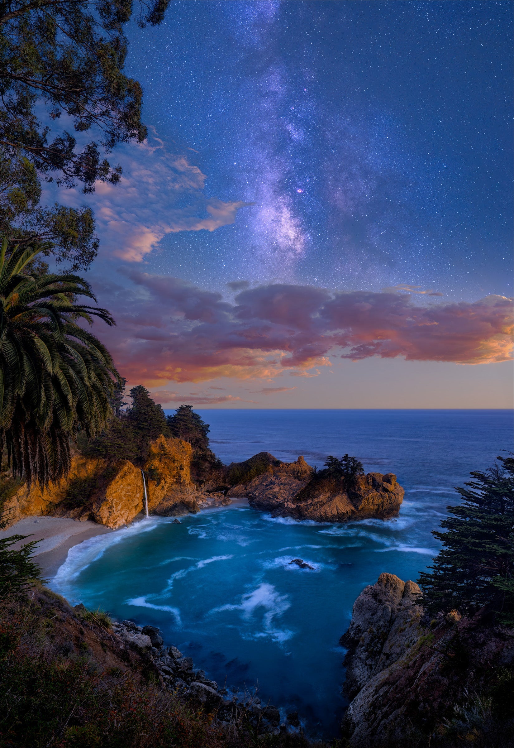 The Californian coast preserves hundreds of miles of untouched beauty and McWay falls has that magical feel about it. During the daytime this location is stunning — but shooting it at night is even more spectacular. The 80-foot waterfall cascades into the Pacific Ocean, creating a natural wonder where inland fresh water meets the sea.